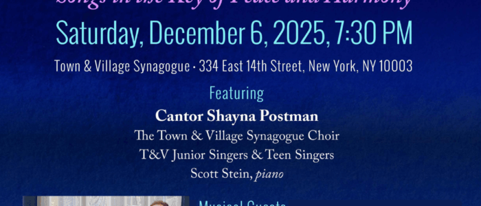 Songs In the Key Of Peace & Harmony. Cantor Shayna Postman Featuring The Town & Village Synagogue Choir, T&V Junior Singers and Teen Singers, Scott Stein, Piano. Special Guests: The Coral Torah Collective – Featuring the Music of Cantor Josh Ehrlich